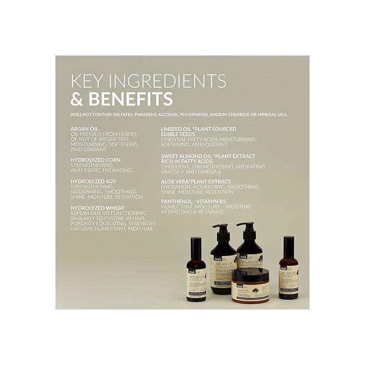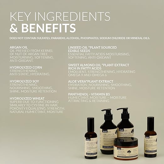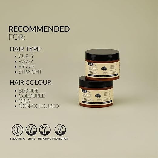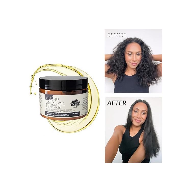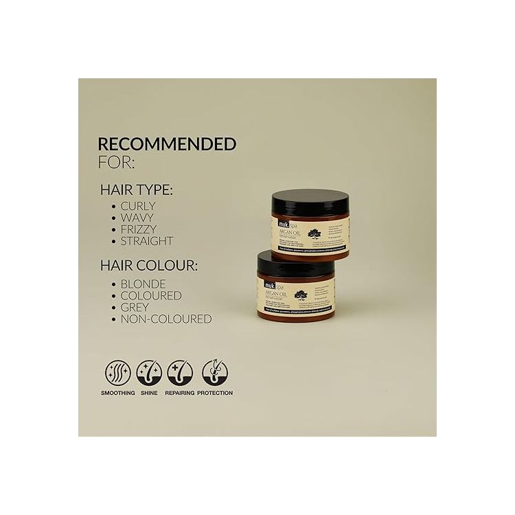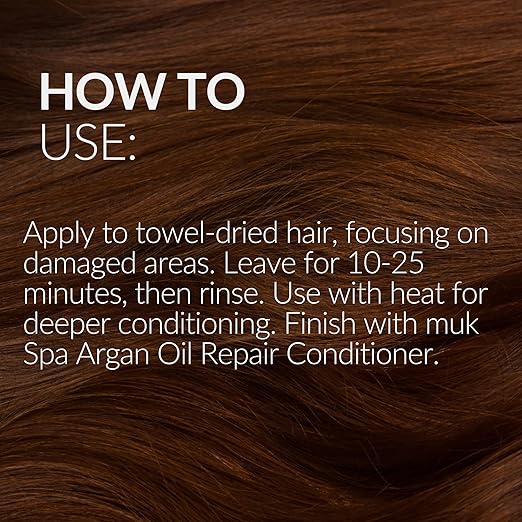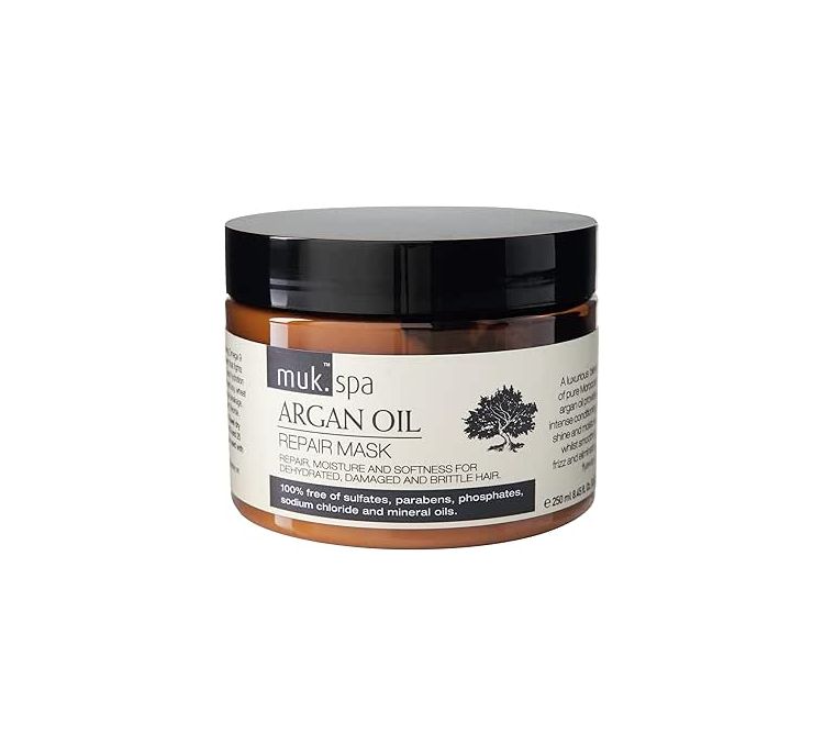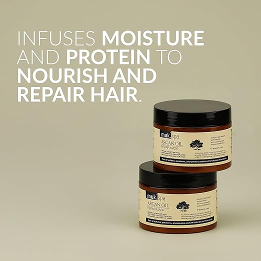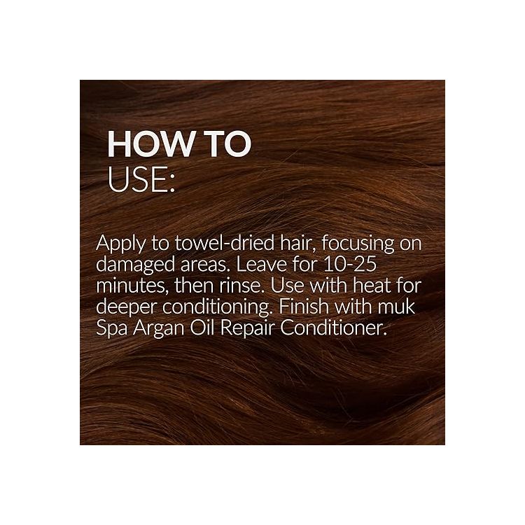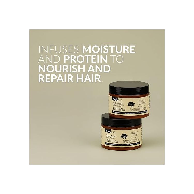 Containing a luxurious blend of pure Moroccan Oil, muk Spa Argan Oil Repair Mask, aids in the repair of dehydrated, damaged and brittle hair, adding moisture and shine. DOES NOT CONTAIN Sulfates, Parabens, Phosphates, Sodium Chloride or Mineral Oils.\n