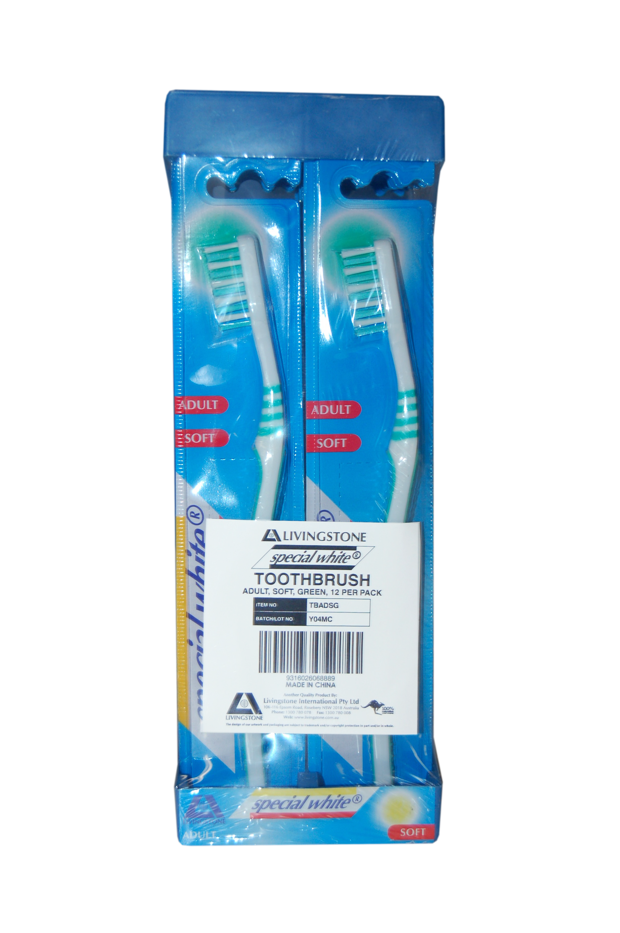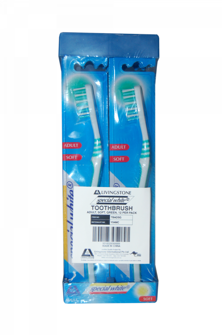 Livingstone Special White Toothbrush, Adult, Soft DuPont USA Bristles, Green Colour, 12 per Pack