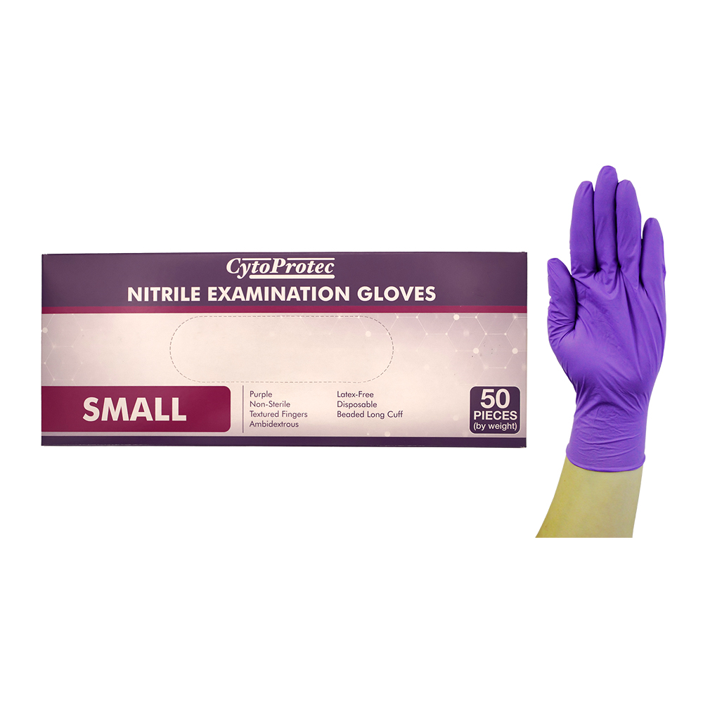 CytoProtec Extra Thick Nitrile Examination Gloves, Powder Free, 6.5-7.0, Small, Purple, Long Cuff, 50 Pieces/Box