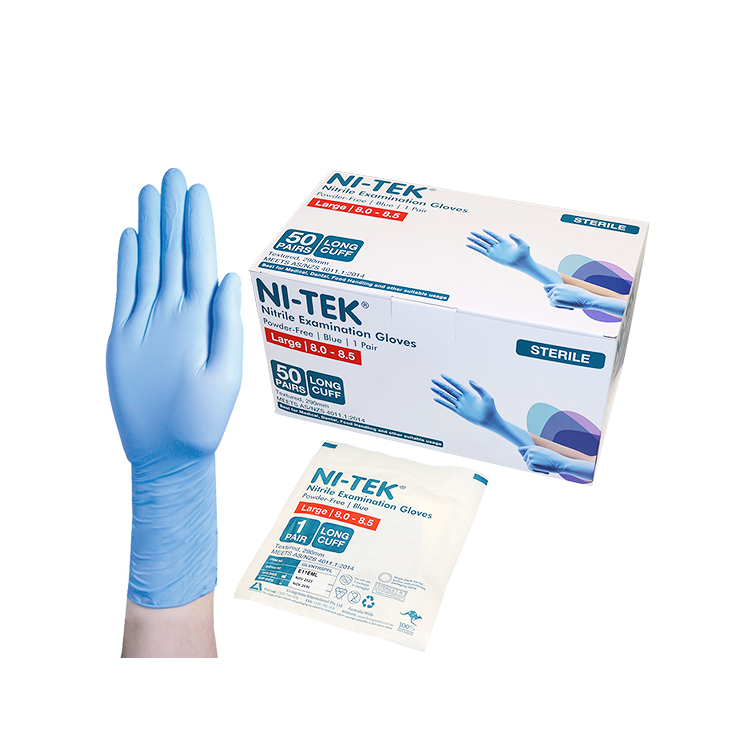 Ni-Tek Nitrile Gloves are made 100% from non-latex synthetic chemical resistant material and latex free containing no natural rubber protein. Powder free reduces skin irritations preventing residue left on equipment and hands. Recommended for if you are sensitive to latex and suffer from type I or type IV latex allergies. Lower in particles, ionic extractable and non-volatile residues. Medical examination grade, features a long cuff and comes as a pair in sterile peel packaging. Unparalleled toughness, resistance to chemicals, tears and blood-borne pathogens. Four times stronger than vinyl and latex gloves. Tight, comfortable, contoured and textured for extended wear and excellent grip. Tears immediately when compromised to alert and eliminate cross contamination. Suitable for latex allergies, surgeons, medical, healthcare, hospital, first aid, laboratory, pathology, emergency services, industrial cleaning, manufacturing, handling blood-borne pathogens, chemicals and minor abrasions.