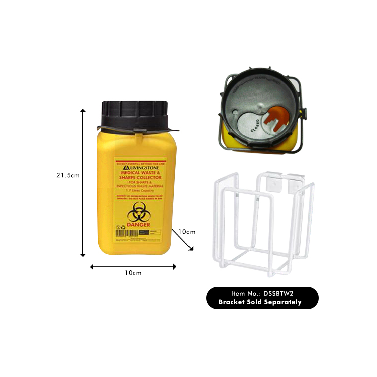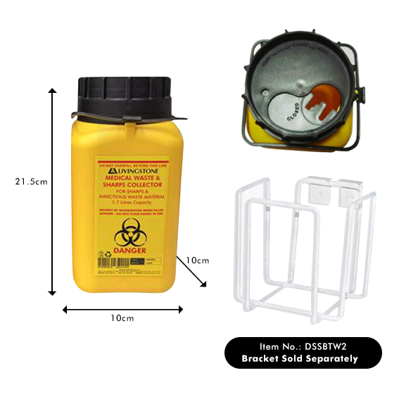 Capacity: 1.5L (safe fill) / 1.7L (max to brim). Do not overfillDimensions: 10 x 10 x 21.5cm, The container has a maximum fill volume line positioned at the recommended fill capacity. No assembling required. The adjustable finger shield enables the user to vary the aperture or opening to suit the user's need for safety and convenience. When ready for disposal, the finger guard can be locked closed to prevent accidental re-opening, overfilling or contamination. The outer cap is easy to screw on for complete sealing prior to disposal. Fits Bracket DSSBTW2. Bracket Sold Separately.