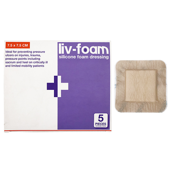 Liv-Foam is an absorbent atraumatic dressing made from polyurethane foam. Suitable for use under compression bandaging. Outer surface of the foam is bonded to a air permeable polyurethane membrane which acts as a barrier to liquid and micro pathogens. Self adherent foam minimises pain and trauma at dressing changes, and does not require secondary fixation. Dressing can remain in place for several days depending on the condition of the wound. Dressing can be lifted and adjusted without losing its adherent properties. Water proof, promotes patient comfort during wear. Silicone reduces risk for skin irritation and allergy. Pad Size: 4.5 x 4.2cm